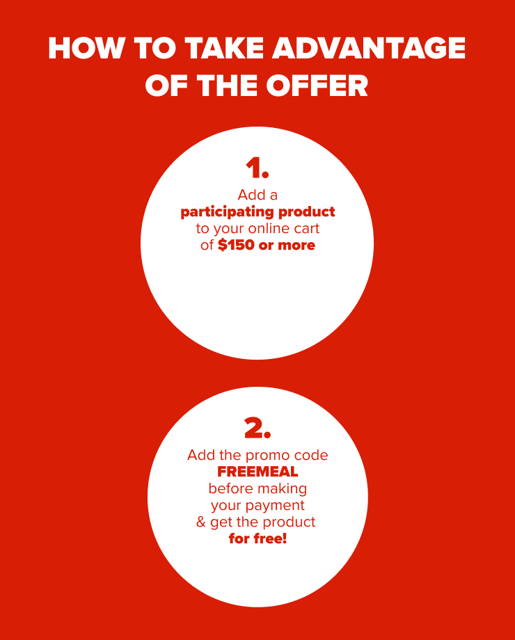 In order to get the product for free, the promo code FREEMEAL must be used at time of checkout on orders of $150 or more, before taxes and fees. Offer is valid from April 14th to April 22nd, 2026, inclusively. Limited quantities. No rain checks. While supplies last.